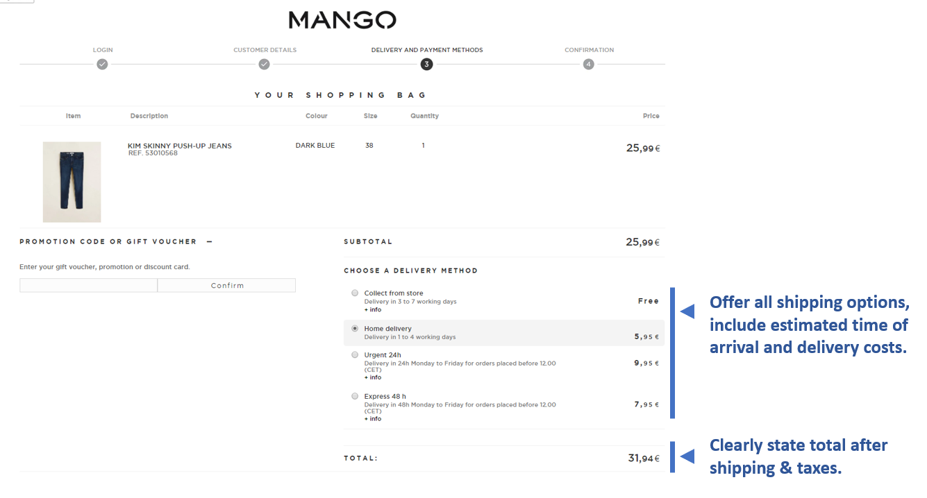 In the example provided, Mango concisely combined shipping detail, delivery methods, and payment options into one page. This is a great way to minimize the number of clicks a customer has to go thru in order to complete the checkout process.